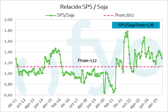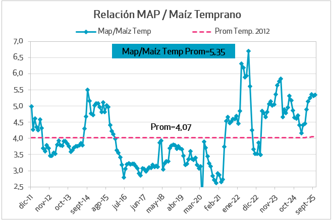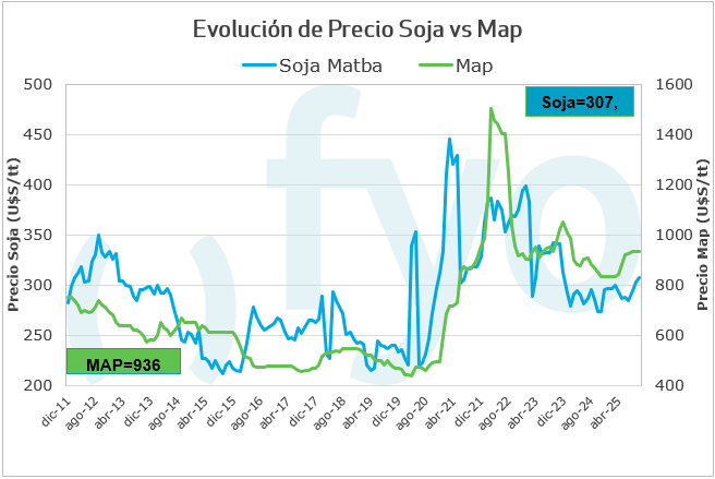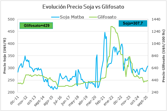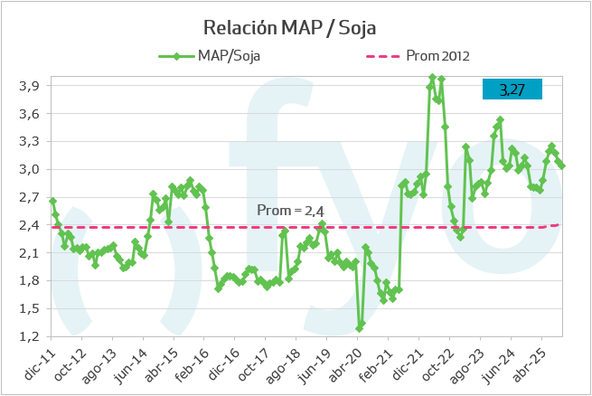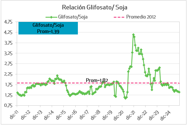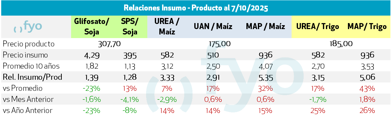 Durante el último mes, las relaciones insumo-producto han mostrado un comportamiento dispar. En el caso particular de la soja, las relaciones son positivas en comparación con el mes y el año anteriores, tanto para el glifosato como para los fertilizantes fosfatados.