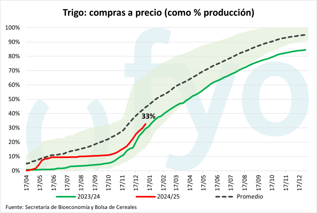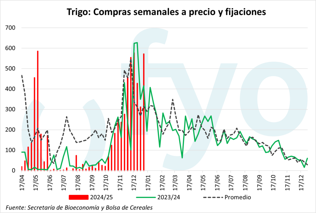En trigo, destaca que las ventas a precio y fijaciones del trigo 2024/25 llegaron a 572.000 toneladas en la semana, muy por encima de las últimas semanas. De esta manera, el 32,7 % de la producción tiene precio, aunque dicho valor se mantiene por debajo de los promedios históricos.