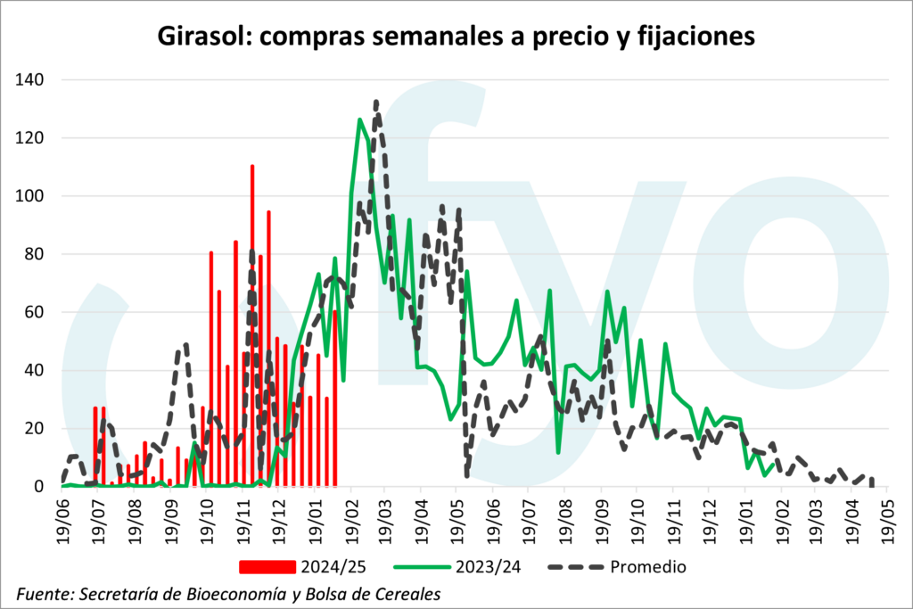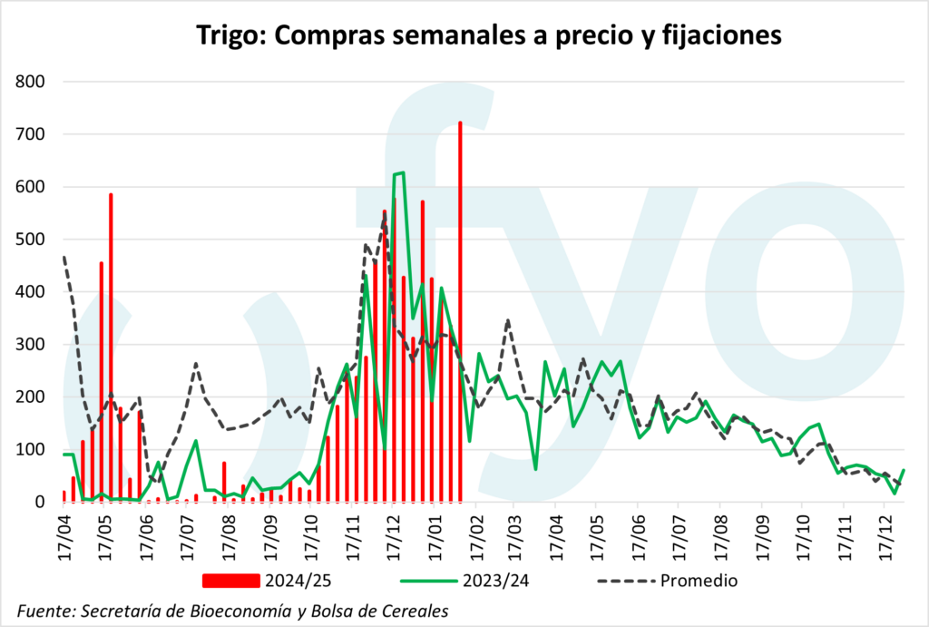 En trigo, las ventas a precio y fijaciones del trigo 2024/25 mostraron un repunte de las 340.000 a las 720.000 t, muy por encima del promedio para esas fechas (260.000 t). De esta manera, el 43 % de la producción tiene precio, aunque dicho valor se mantiene por debajo de los promedios históricos (51%).