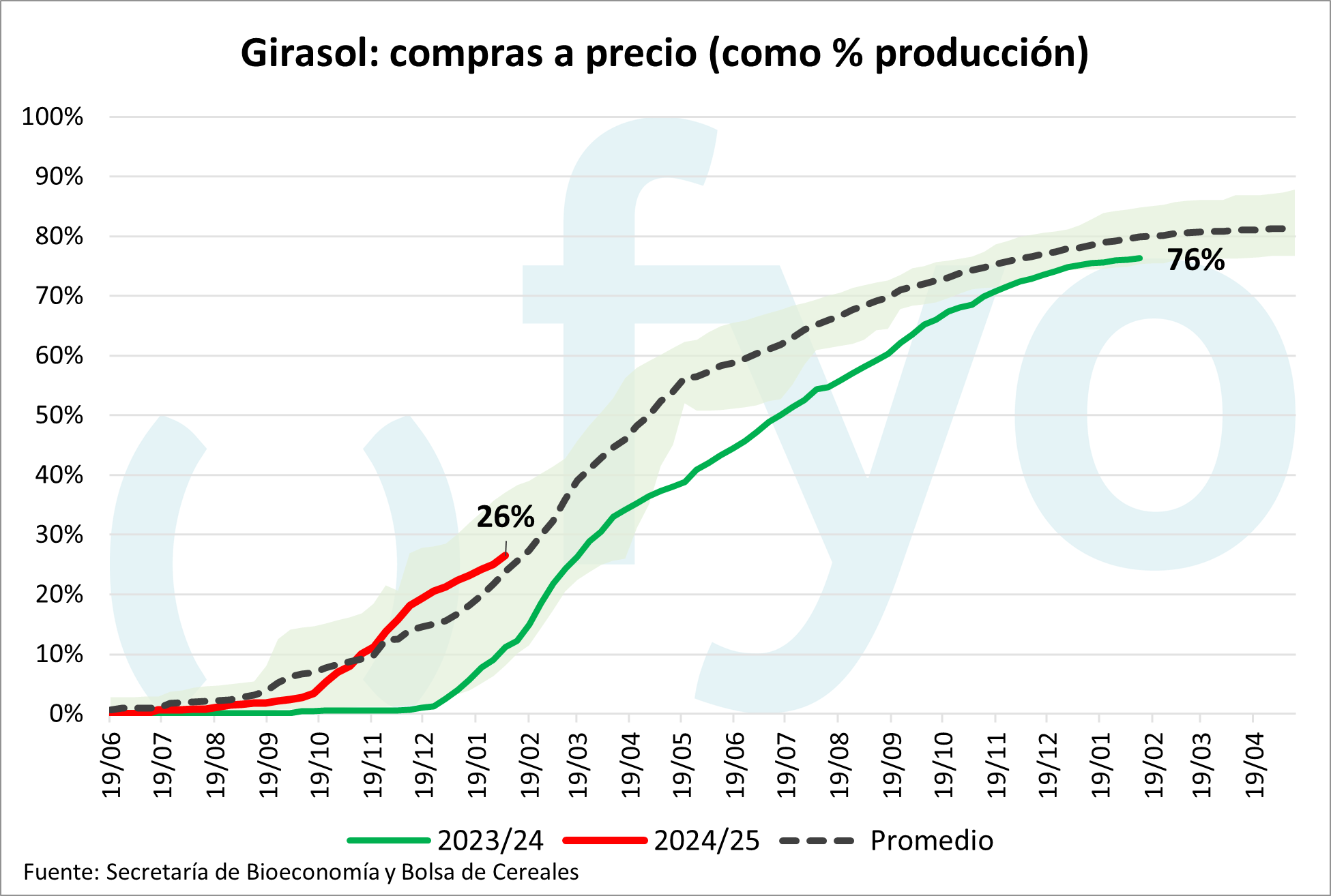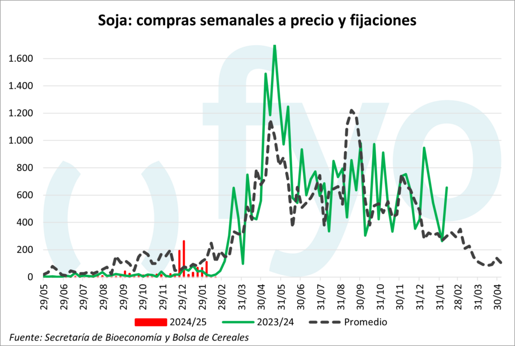 El ritmo de comercialización de soja disponible creció, con compras a precio y fijaciones semanales por 656.000 t. A su vez, el porcentaje de la producción total con precio es menor al promedio histórico (67,1% frente a 76,3%). En el caso de la soja nueva, la originación se ubicó en 225.000 toneladas, por debajo del promedio para estas fechas (440.000 t)