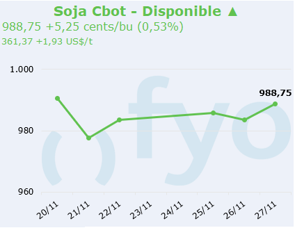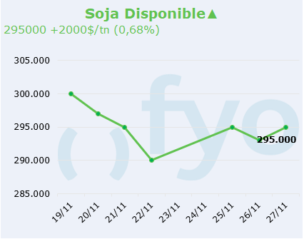 - En la jornada de hoy, con CBOT en verde, la soja logró llegar a pagarse a $295.000, fue el techo y quedó abierto a esos valores. Se notó mayor dinamismo de negocios.