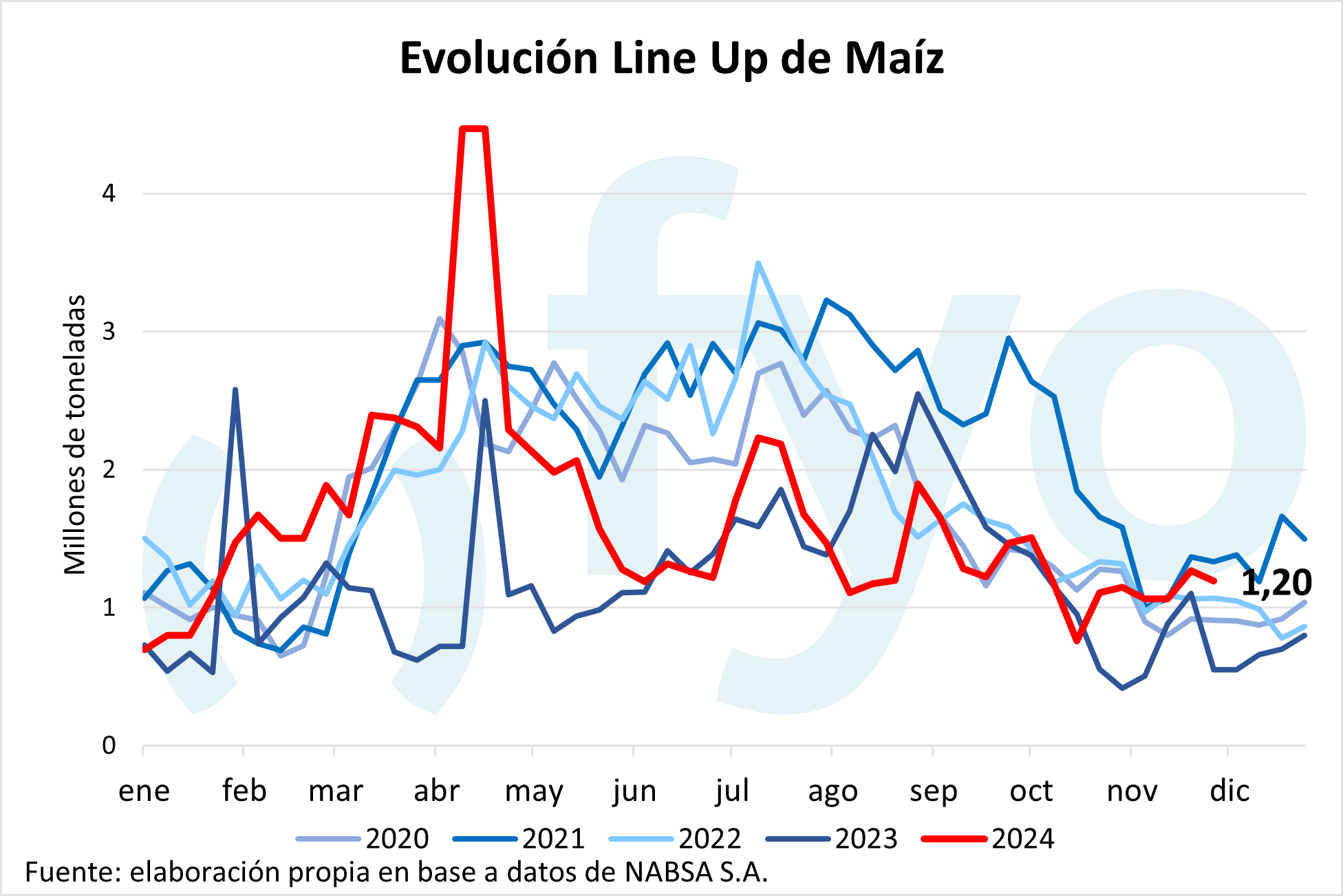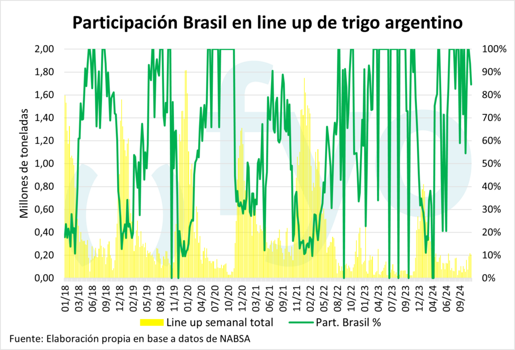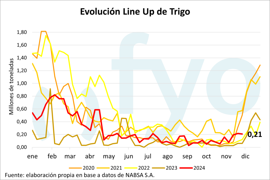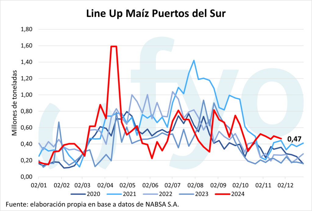 El line-up de maíz cayó en 70.000 t, hasta las 1,2 Mt, reduciéndose, a su vez, los compromisos en los puertos del sur. En cuanto a la soja, seguimos sin programa de poroto, mientras que para la harina crece en 76.000 t, alcanzando las 950.000 t. El aceite de soja, con 300.000 t programadas, supera por 100.000 t los promedios para esta fecha. Por otro lado, el volumen programado de trigo se mantuvo estable, con 210.000 t destinadas a Brasil y Chile.