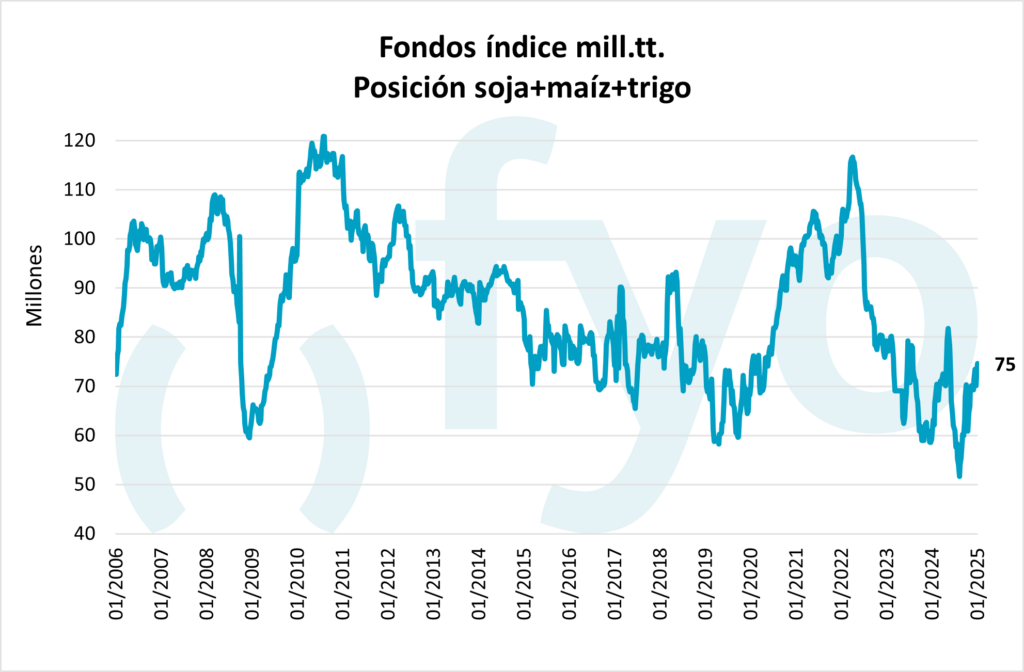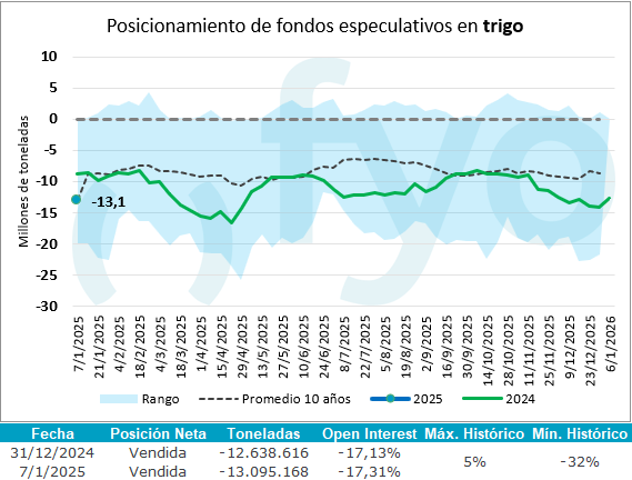 En el caso de la soja, se registraron nuevamente compras, esta vez por 1,63 millones de toneladas. Durante las últimas tres semanas, se observó una tendencia compradora que acumuló 7,2 Mt, lo que resultó en una posición neta vendedora equivalente a 6,8 millones de toneladas en futuros y opciones. En cuanto al maíz, también se registraron compras por tercera semana consecutiva, alcanzando un total acumulado de 12,1 Mt, lo que profundiza la posición compradora hasta cerca de 15 millones de toneladas. Por último, en el caso del trigo, la variación en el posicionamiento fue poco significativa.