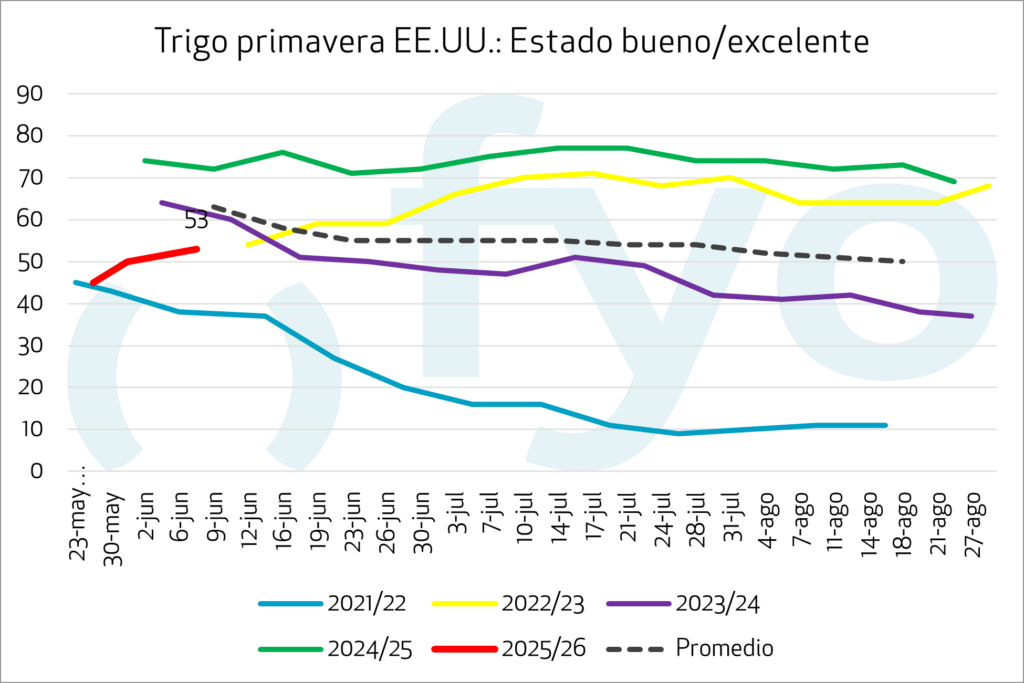 Por su parte, la condición del trigo de primavera buena-excelente incrementa 3 p.p. hasta el el 53%, aunque este valor se mantiene por debajo del último año (72%) y del promedio de los últimos años (56%).