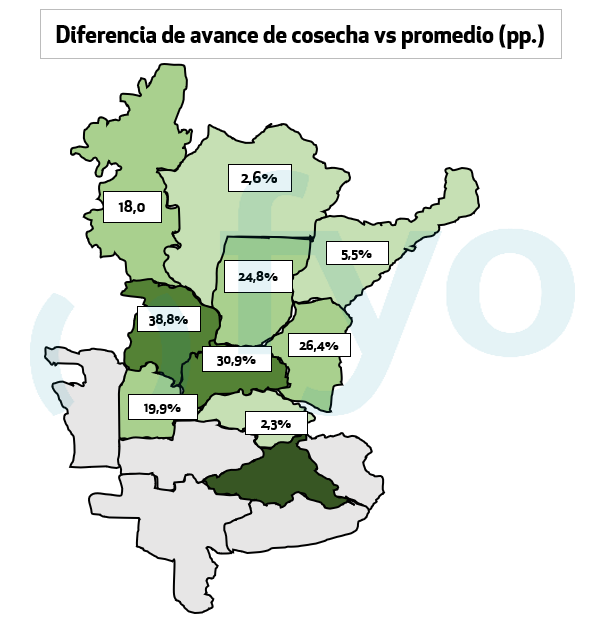 - La cosecha se ubica en el 38,7% del área, mostrando un avance en la semana de 9,4 p.p.