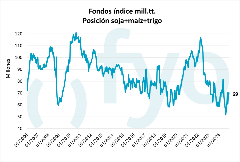 En soja, luego de dos semanas con ventas por casi cuatro millones de toneladas, los fondos anotaron ligeras compras, lo que resultó en una posición neta vendedora equivalente a 11,9 millones de toneladas en futuros y opciones. En el caso del maíz, volvieron a registrarse ventas netas, acumulando en las últimas tres semanas 7,7 Mt en ventas; así, la posición neta permanece vendida. En el caso del trigo, se registró la cuarta semana de ventas, acumulando en dicho período 4,4 Mt, lo que llevó a la actual posición negativa de 13,4 millones de toneladas.