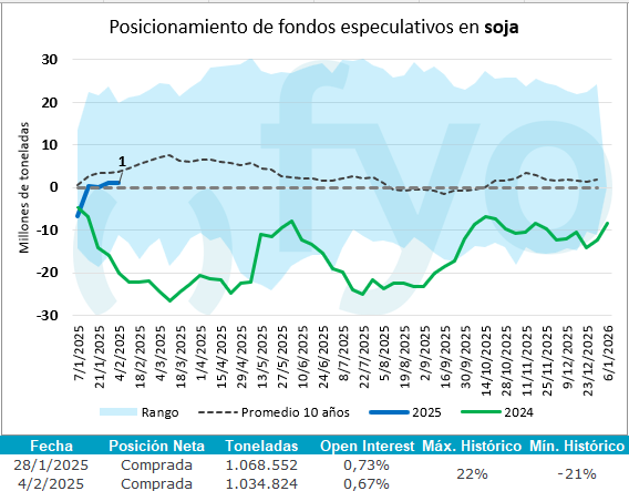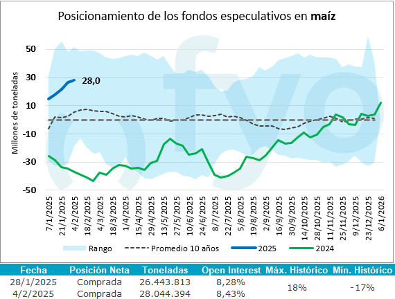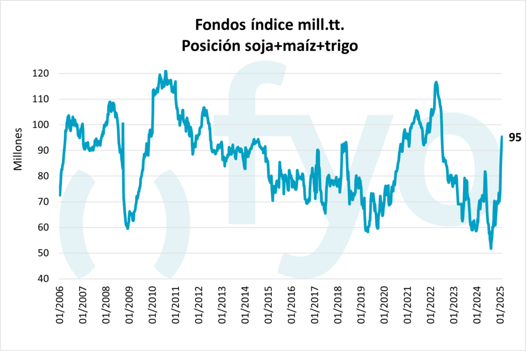 En el caso de la soja, no se mostraron importantes variaciones, con una posición neta compradora equivalente a un millón de toneladas en futuros y opciones, luego de más de un año en posición vendedora. En cuanto al maíz, se registraron compras por séptima semana consecutiva, alcanzando un total acumulado de 25,4 Mt, lo que profundizó la posición compradora hasta 28 Mt. Por último, en el caso del trigo, se registraron compras netas por más de dos millones de toneladas.