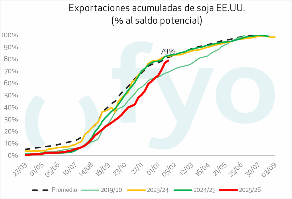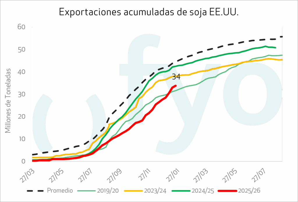 Las ventas de soja se situaron en 819.000 toneladas, dentro del amplio rango de expectativas de 400.000 a 1.800.000 toneladas, marcando el nivel más bajo de las últimas cinco semanas. Los compromisos totales suman 33.856.084 toneladas, lo que supone una reducción del 20,4% respecto a las 42.565.042 toneladas de la campaña pasada, recortando la brecha que llegó a ser del 40% en noviembre. China adquirió 170.000 toneladas, totalizando 9,7 millones de toneladas frente a los 20,2 millones del ciclo previo.