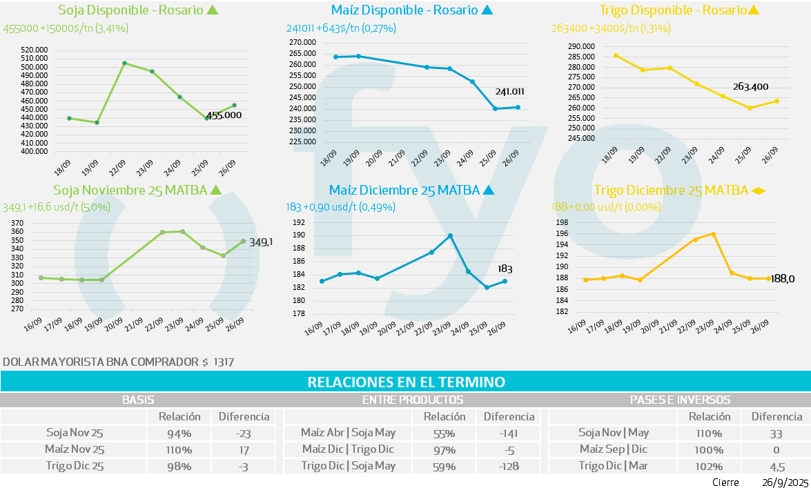 - Los fondos especulativos registraron ventas netas por el equivalente a 4,1 millones de toneladas en futuros y opciones. De esta forma, la posición neta de los fondos se mantiene vendedora en 11,9 Mt al 23/9.