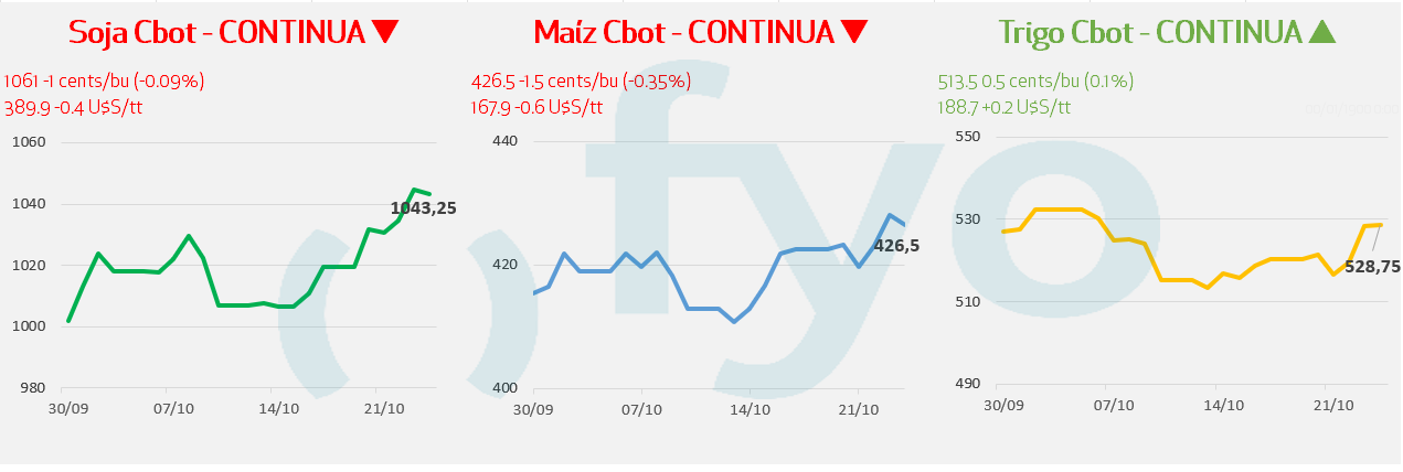 - Los futuros de la soja cotizan a la baja luego de subir durante la jornada de ayer impulsada por la suba del petróleo. A pesar del retroceso del día, el contrato se mantiene en camino a su mayor ganancia semanal en 10 semanas.