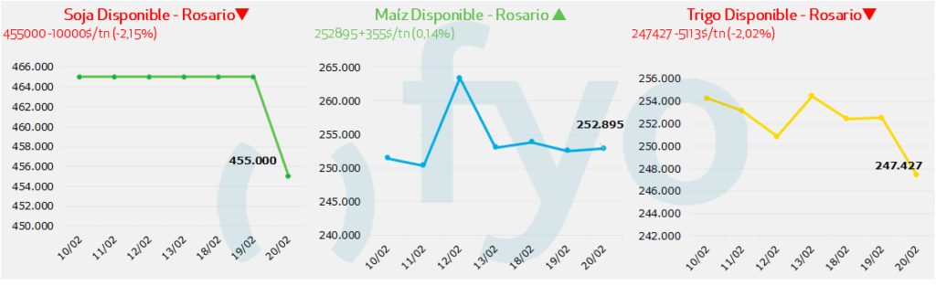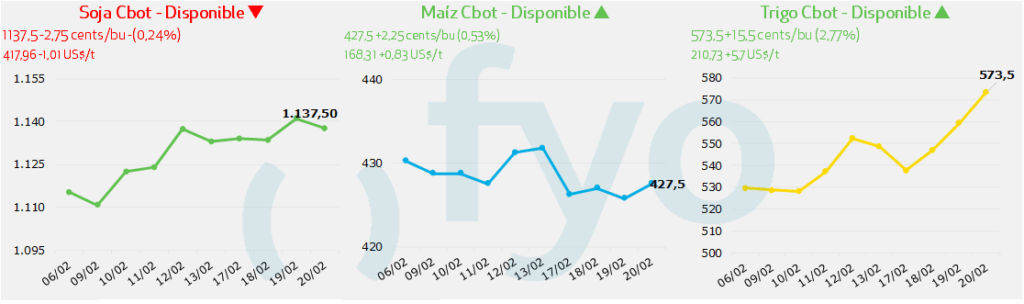 - En Francia, la oficina agrícola FranceAgriMer reportó que la condición de los cultivos de trigo blando cayó al 88% en la categoría de “bueno a excelente” al 16 de febrero, frente al 91% de la semana previa, como consecuencia del exceso de humedad por lluvias torrenciales. Esto genera incertidumbre sobre el potencial productivo de la campaña actual.