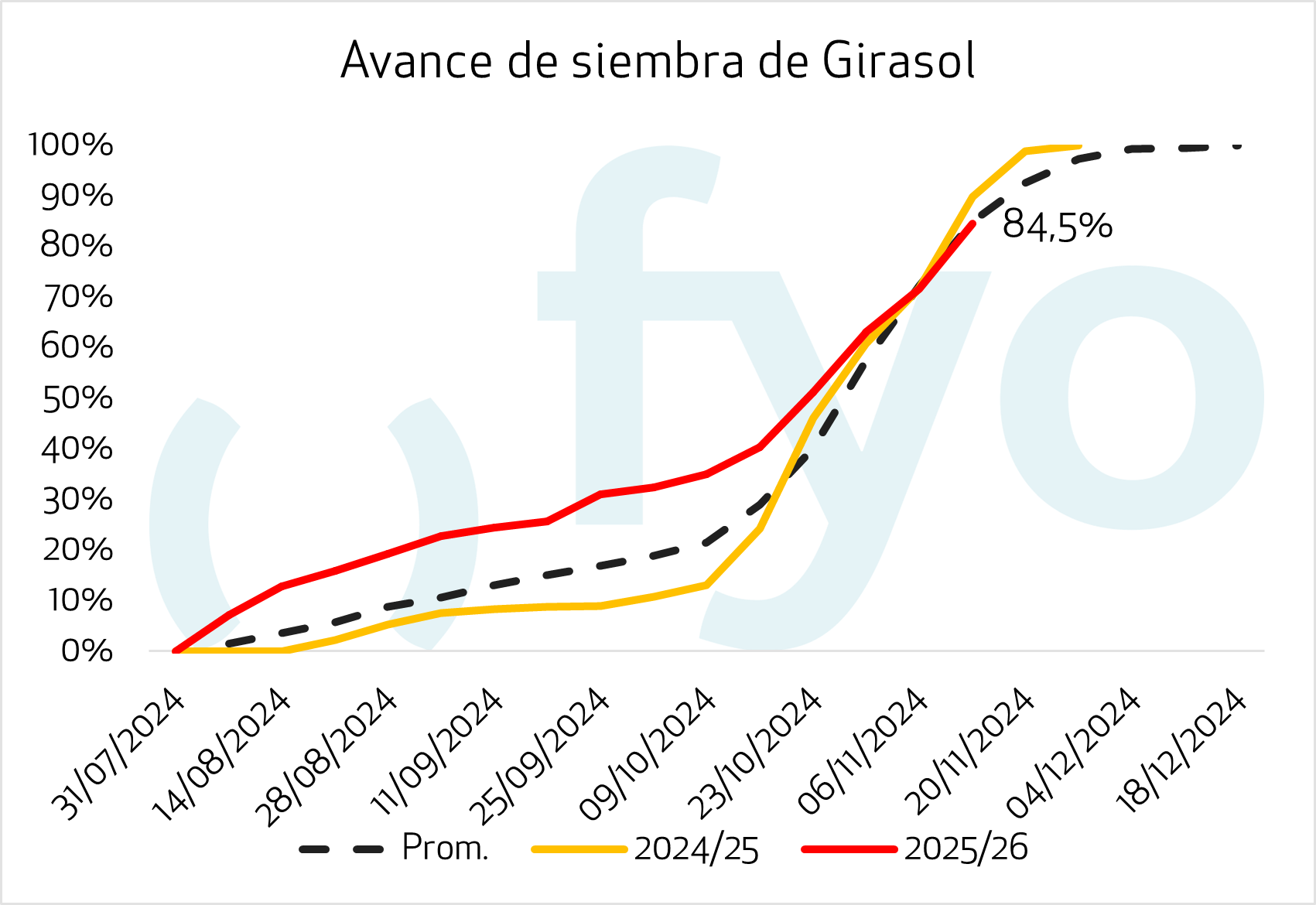 - La siembra avanzó 12,9 pp. en la semana , cubriendo el 84,5% de las 2,7 MHa proyectadas.