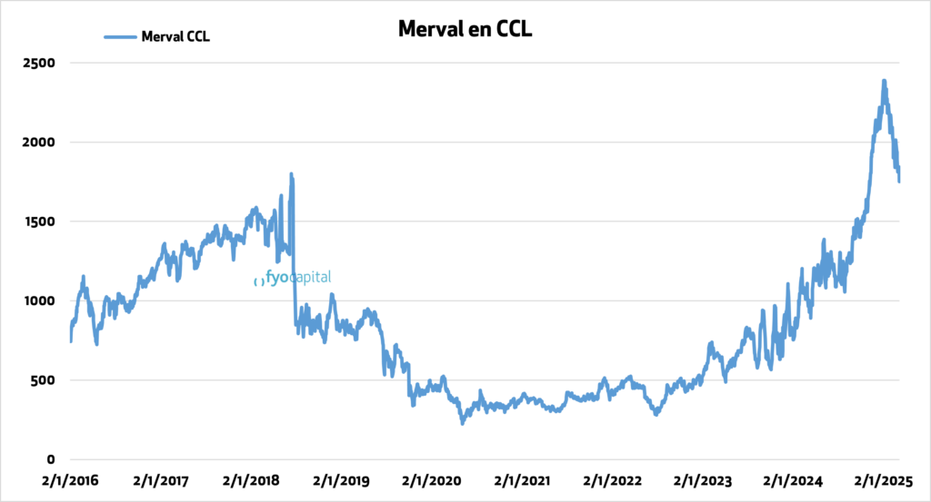 Hoy el merval anotó una caída del 5.6% medido en dólar contado con liquidación, lo que termina de concretar una caída acumulada de 24.1% este año y 28.3% desde máximos, en lo que viene siendo un duro año para los activos argentinos. Pero esta caída no es un fenómeno puramente argentino, sino que se trata de un desarme de posiciones de riesgo a nivel global y búsqueda de refugio en activos seguros, como observamos en el hecho de que el S&P500 lleva -8.7% este año y la tasa a 10 años de los bonos cayó desde 4.6% a 4.2%.