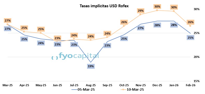 La curva de renta fija en pesos continúa anotando pérdidas a partir de dos grandes drivers: mediciones de alta frecuencia que muestran datos de inflación poco auspiciosos para febrero, impulsados por un repunte del precio de la carne; y en segundo lugar por desarme de posiciones de carry trade del público. Esta tarde se darán a conocer las condiciones de licitación que tendrá lugar el miércoles. En esta oportunidad va a ser muy importante seguir qué títulos saldrá a ofrecer el Tesoro, quien durante las últimas dos licitaciones debió ofrecer lecaps a corto plazo y un premio para lograr rollear los vencimientos.