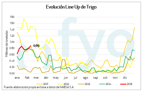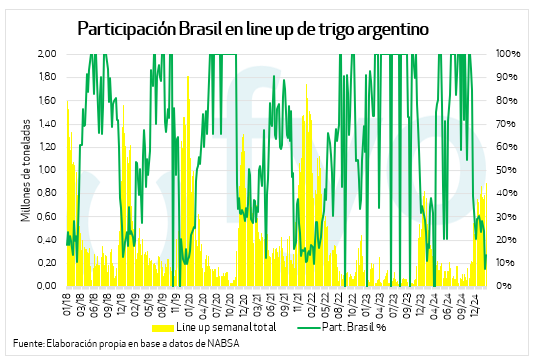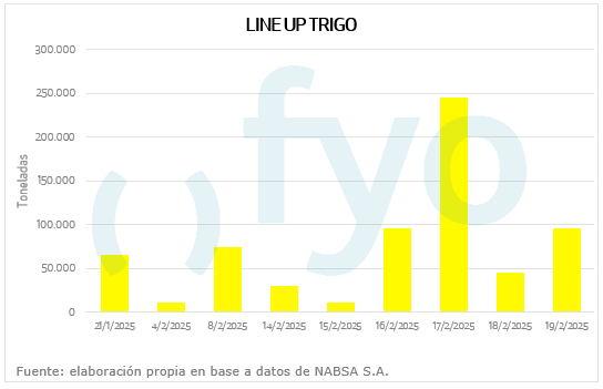 Por último, el line up de trigo crece a 890.000 tras sumar 10.000 Tn respecto de la semana anterior, con Brasil como destinatario del 13% de los compromisos.