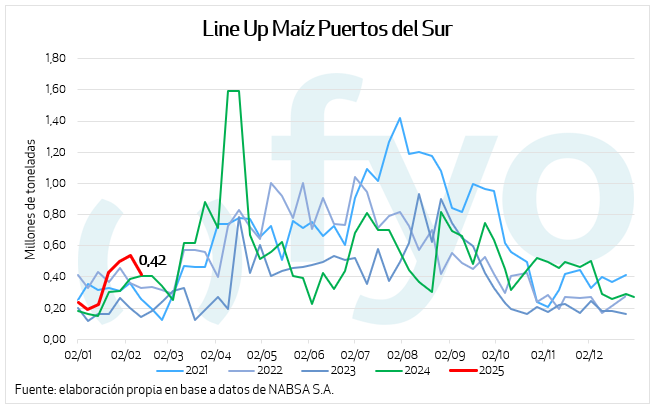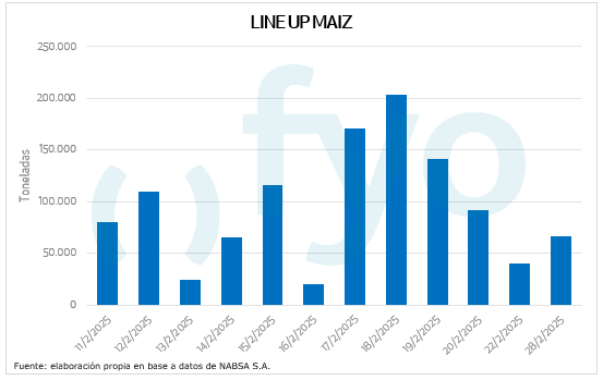 La agencia Nabsa informó los compromisos de embarque para las próximas semanas. El line up de maíz se mantiene por encima de los promedios para la fecha, pero cae por segunda semana consecutiva disminuyendo intersemanalmente 200.000 Tn hasta acumular 1,46 Mt comprometidas a embarcar los próximos días.